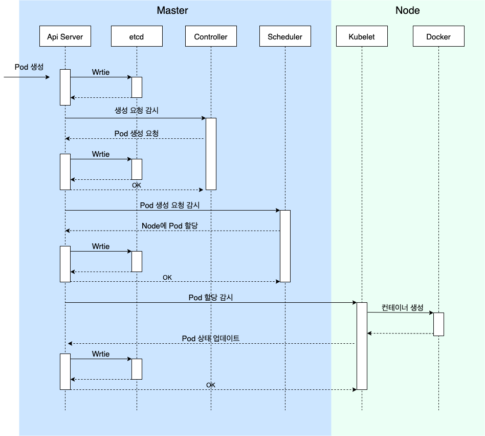 위의 그림을 통해서 Pod하나를 띄우는 과정에서도 쿠버네티스 내부의 여러개의 마이크로 서비스들이 각자의 역활을 수행하여 동작한다는것을 확인할 수 있습니다.