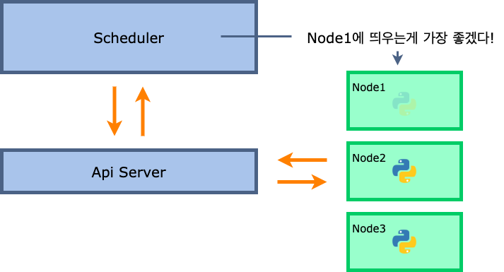 Scheduler는 위의 Controller에서 새로운 워크로드(Pod)를 띄워야 한다고 했을 때 어떤 Node에 띄워야 하는지를 결정하게 됩니다.