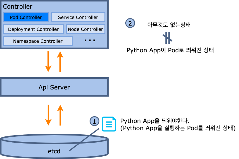- Controller는 etcd에 저장되어있는 내용을 지속적으로 확인하고 있습니다.