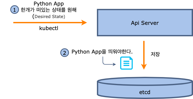 - 우리가 보낸 요청은 Api Server가 받게 되고 etcd라는 key, value저장소에 어떤 상태가 되어야 하는지를 저장합니다.